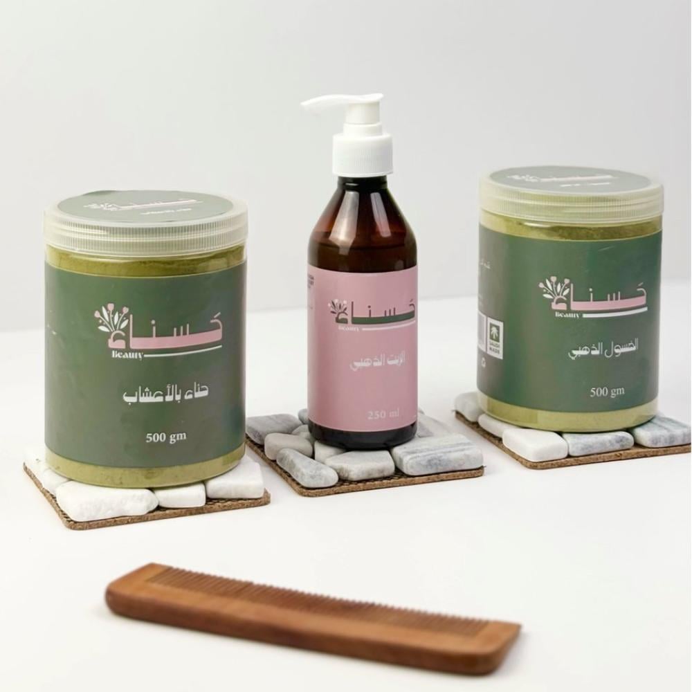 يحتوي البكج على ( حناء بالاعشاب + الغسول الذهبي + الزيت الذهبي)